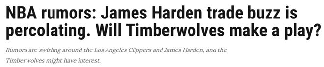 曝多队密切关注哈登!森林狼成潜在下家:只等快船愿意听取报价